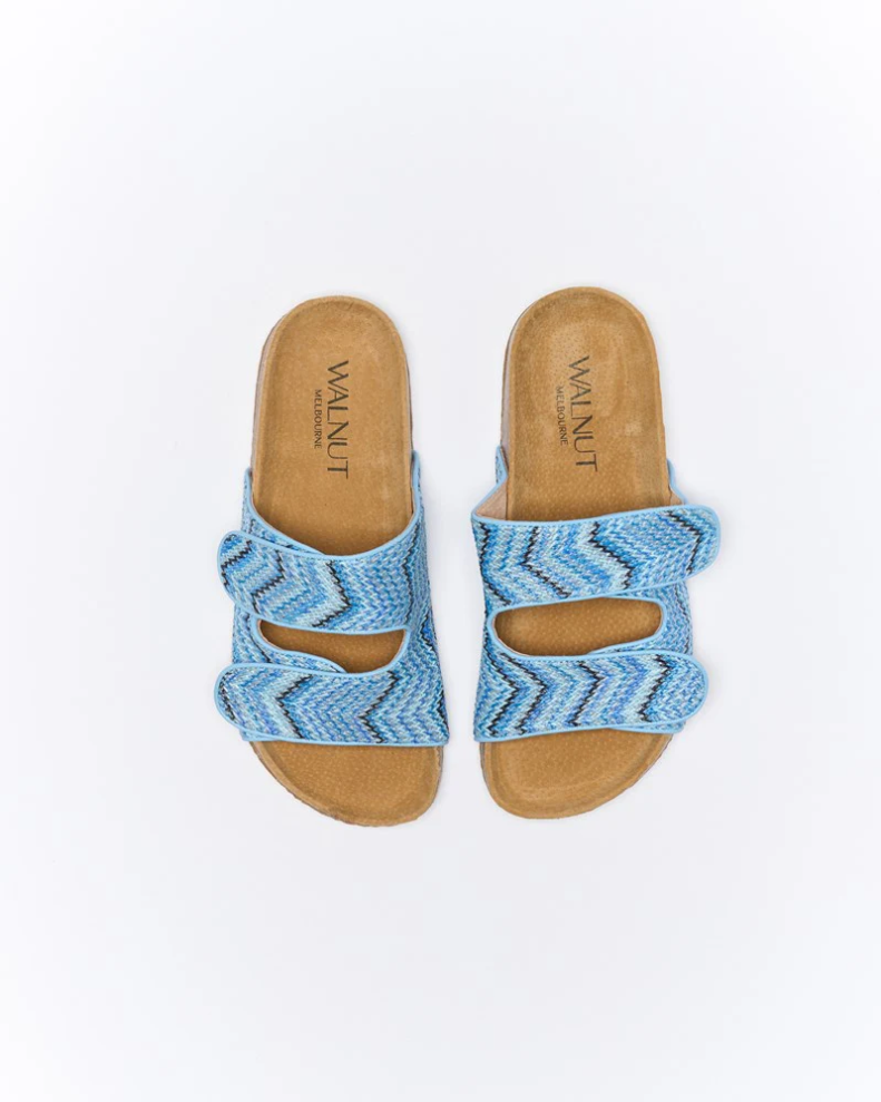 Channel effortless summer energy with the Beach Slide in Blue Multi. Featuring a zigzag woven upper in tonal blues, this sandal brings a playful pop of pattern to any outfit. The double velcro straps offer an adjustable, secure fit, while the contoured cork footbed delivers comfort that lasts all day. Whether you're seaside or city-bound, this lightweight slide is your go-to for easygoing style.